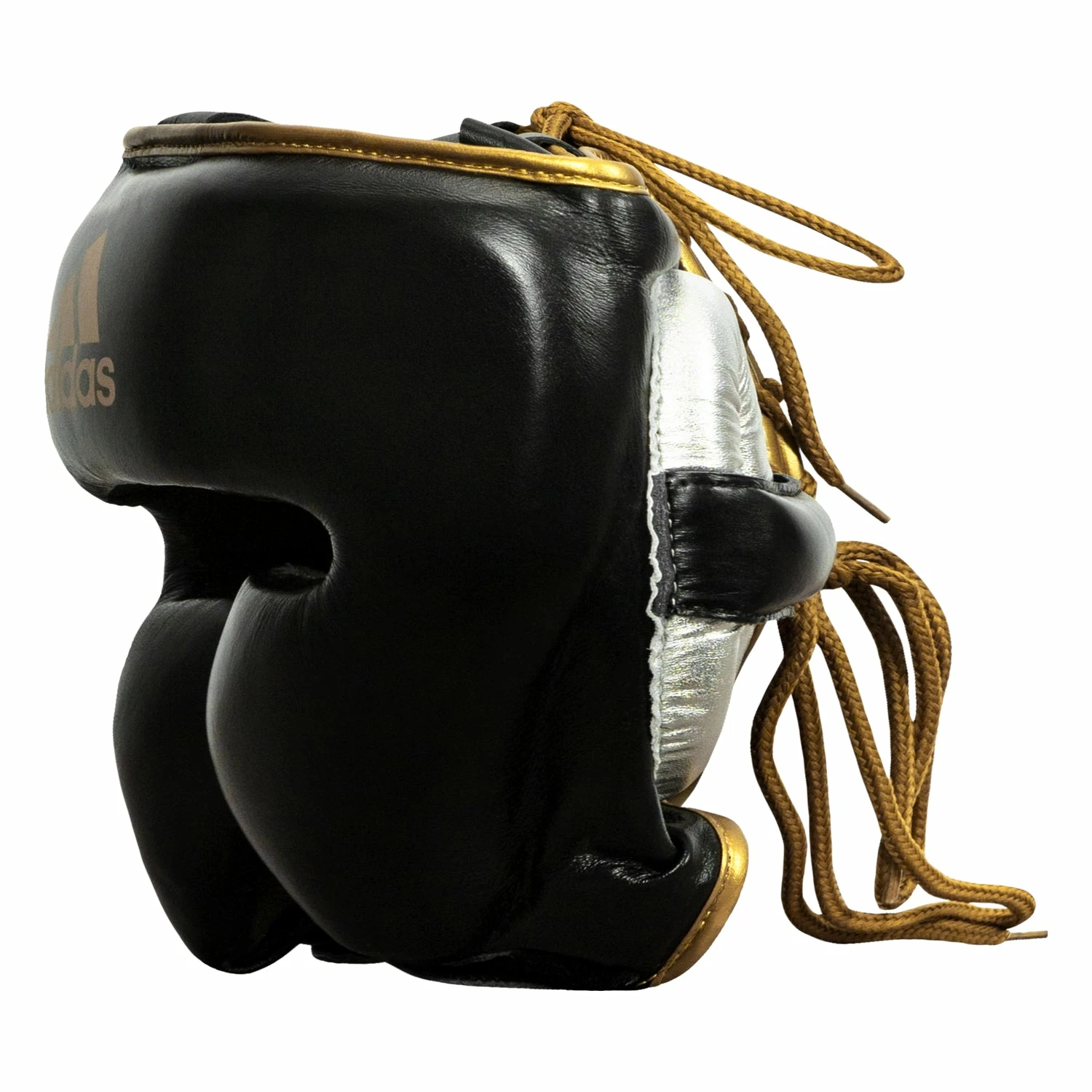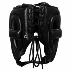 Cowhide leather with amara inside lining. Lace-up closing system on back and top. Multi layered high density EVA foam padding. Hook & Loop chin closing system. The ultimate boxing sparring headgear.