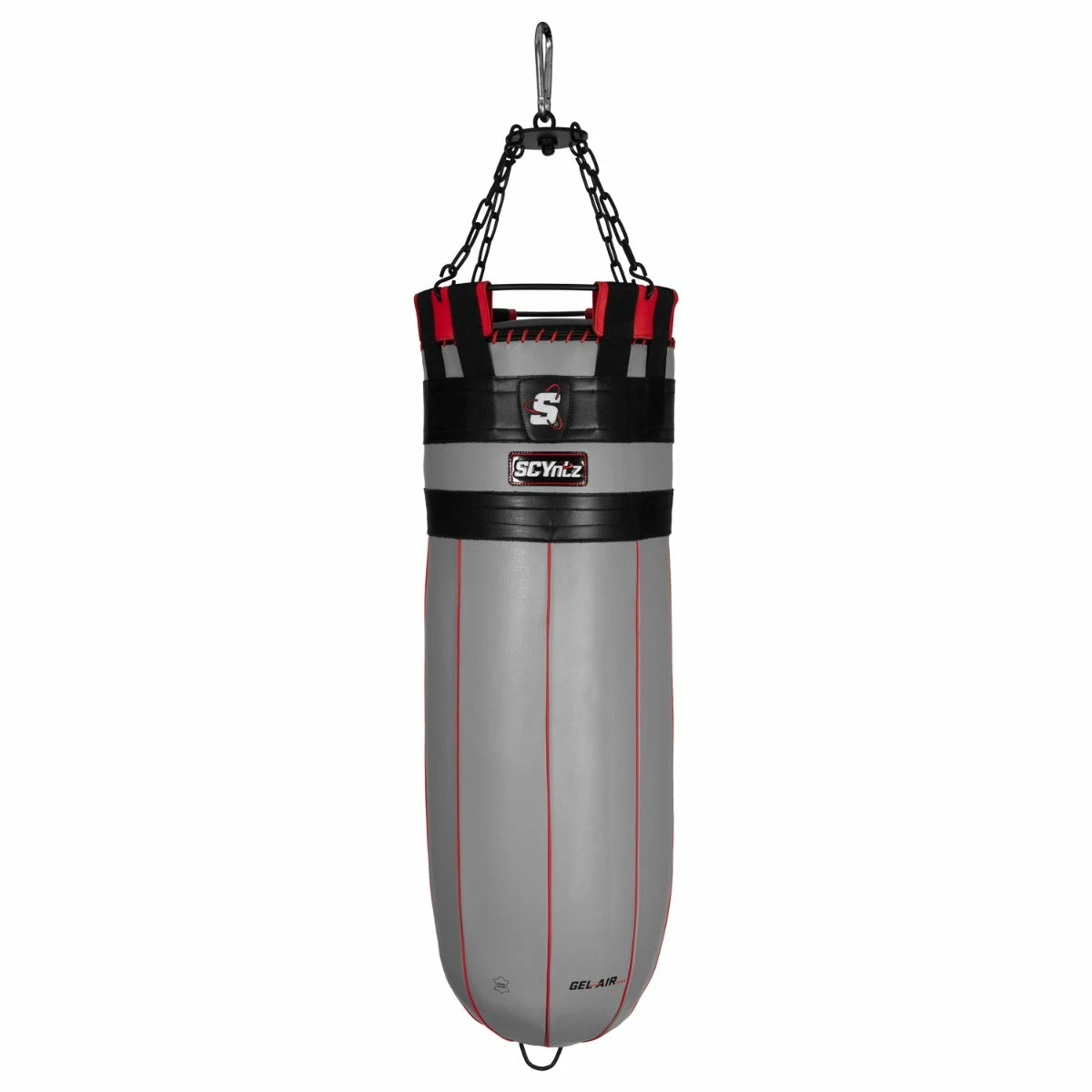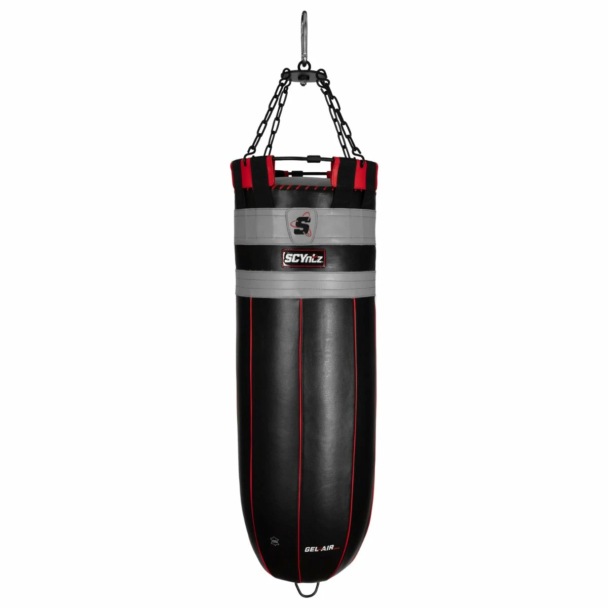 The exclusive SCYntz Leather Bullet Bag is built for ideal work on all key target areas: the head, body and everything in between. The bag is constructed from 2.2mm thick genuine leather featuring 2” of GEL Air Foam with a soft fiber center and double-stitched seams that are reinforced with nylon/leather straps to prevent wear and tear. SCYntz’s revolutionary GEL Air Foam consists of alternating GEL layers that have been infused with tiny pockets of air working together to raise the bar in shock-absorption technology. Hang your bag with the durable galvanized metal chain and circular swivel ring and if you want even more stability, the bag also has a posterior D-ring to create a stationary target.