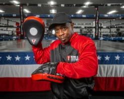 All new and technologically advanced with 100% genuine leather construction, professionally contoured pre-curved design, and increased rubber palm ball for the ultimate in training experience.  More than 1.75″ of multi-layered, impact resistant foam lining for every level of offensive arsenal.  New moisture wicking inside lining and rear hand cover breathing slots allow hot air release and help keep training cool and dry. Anatomically correct for less hand fatigue, more comfort and shock resistance. Complete with padded wrist cover, back finger cover and leather wrist security strap for a secure, no-slip training experience . . . every time.