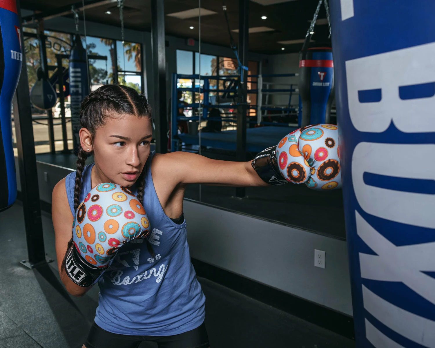 Incredible dura-lined Neoprene striking cover delivers professional, durable and long-lasting results, for all skill levels. Exclusive Infused Foam® over the fist and knuckles forms an unbelievably comfortable, natural closure, with a lighter, more impact-resistant core for all the performance, protection and execution athletes demand in their boxing workouts and bag training. TITLE Infused Foam® technology is the rage sweeping the world in boxing glove manufacturing and performance. Nylon-mesh upper palm air release inset allows athlete to stay cooler and drier during workouts. Padded palm face makes gloves more comfortable during use, and offers additional support. Full wrap around wrist strap with hook-and-loop closure offers increased wrist stability and coverage, with a snug, secure, no-slip fit. Unique craftsmanship and materials allows gloves to be machine washed in cold water on gentle cycle, if required. These fully sublimated Donut Gloves will be the hit of all your friends and gym members
