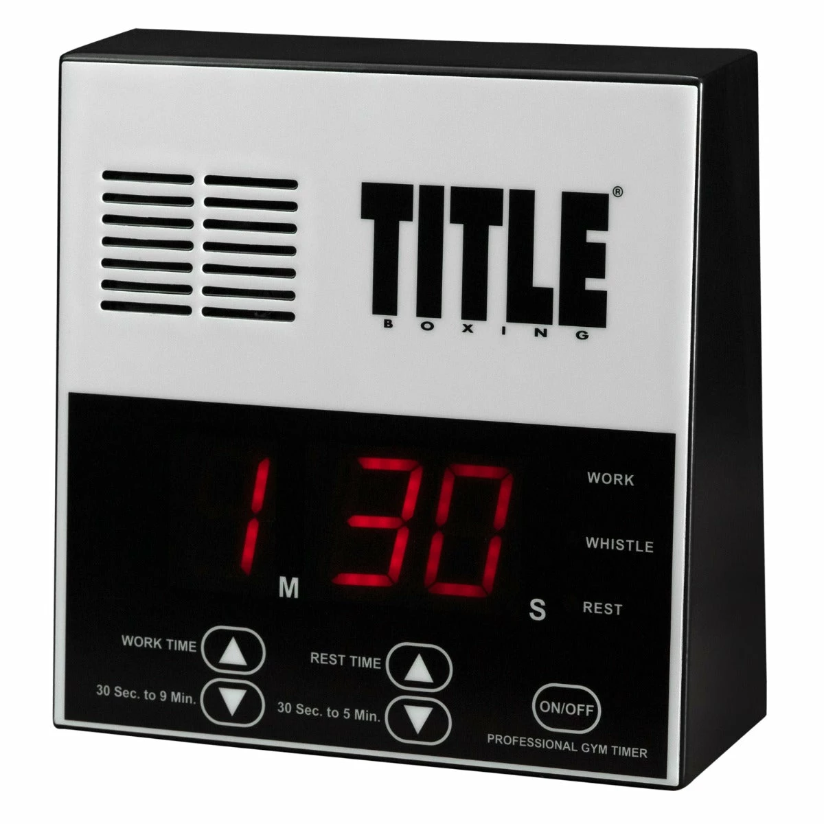 The ideal digital countdown timer for any sized gym or individual workouts. This is the most versatile gym training timer available for the price. Round lengths can be easily set from 30 seconds to 9 minutes. Rest time can be adjusted from 30 seconds to 5 minutes. Use for all boxing, MMA, grappling, wrestling and combat training, as well as all conditioning and cardio workouts. Extra large 2″ digital display can be seen in any size gym. Complete with accompanying lights to show Work, Rest or 30 Seconds remaining in the round. Also includes a high, medium and low bell volume control to adjust sound for any size training area. Complete 1-year warranty.