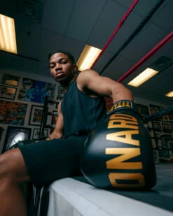 Inspired by the classic rematch that took place on November 25, 1980, when Ray Leonard regained his welterweight title against Roberto “Hands of Stone” Duran. This classy and clean gold-on-black look was also worn against future opponents, like Bruce Finch, Larry Bonds and Donny Lalonde.