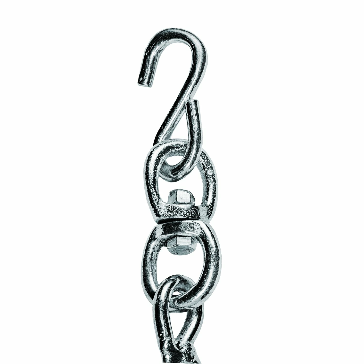 Solid stainless steel chain links and pro style swivel with zinc galvanized finish offers super strength, efficient and tangle-free heavy bag training. Pro style swivel allows heavy bag to naturally move and spin without bunching or knotting. Includes four end S-Hooks for fast and convenient attachment. Fits heavy bags with four top D-rings. Ideal for heavy bags up to 80 lbs. 18” Length.