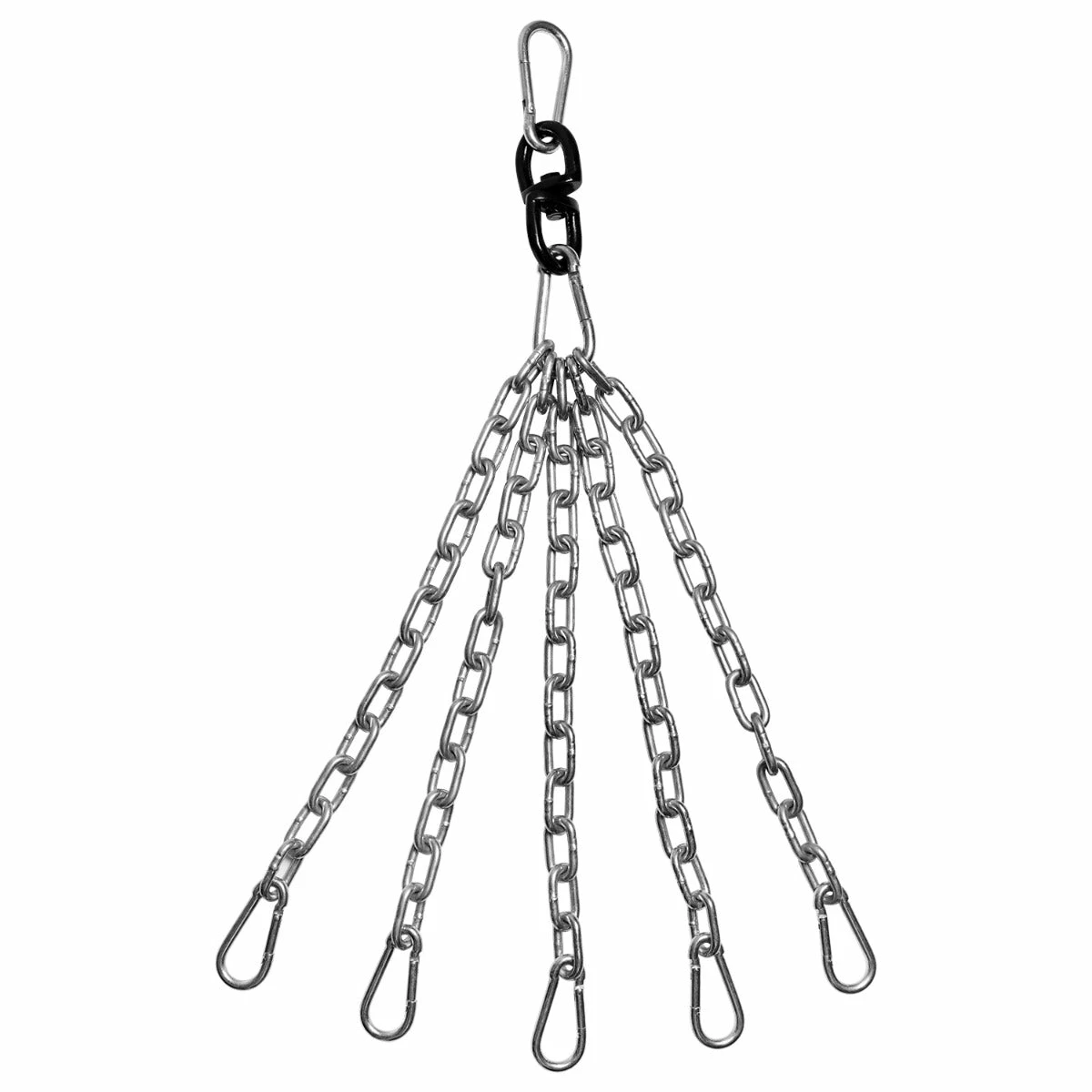 Built for professional gyms, industrial and institutional use! Designed to custom fit any heavy bag. Professional grade, industrial strength stainless steel chain links with zinc galvanized finish and super grade pro style swivel. The pro style swivel allows heavy bag to naturally move and spin without bunching or knotting. Includes five chains for larger heavy bags with five top D-rings. Chain(s) can be removed in seconds for hanging heavy bags with four or less D-rings. Complete with two high strength Spring Hooks and five professional grade quick links for speedy, convenient and secure attachment . . . every time! Custom fits heavy bags with 2, 3, 4 or 5 top D-rings. Ideal for heavy bags up to 250 lbs. 29” Length.